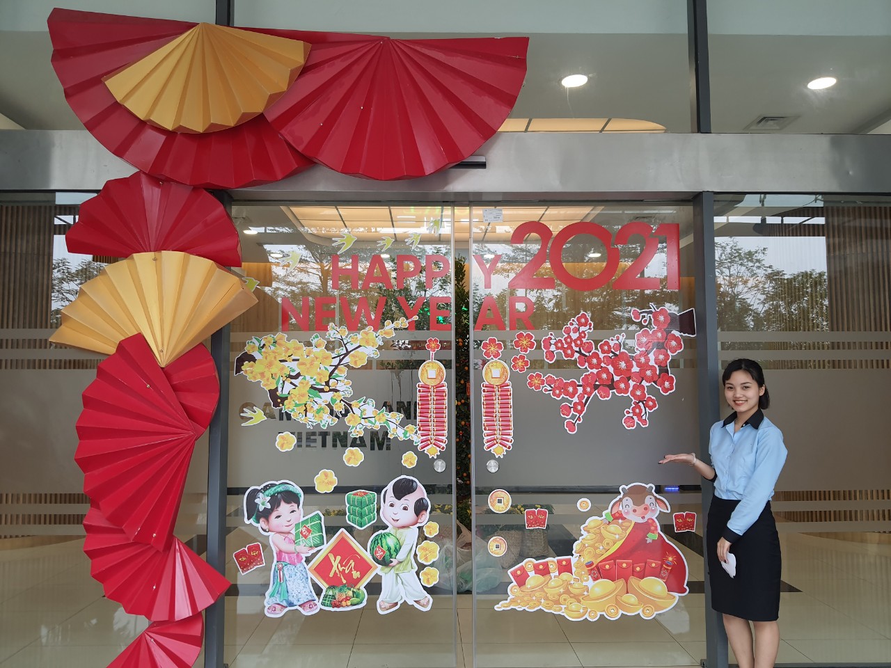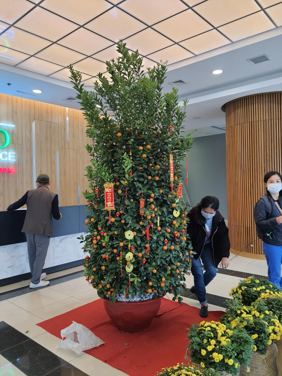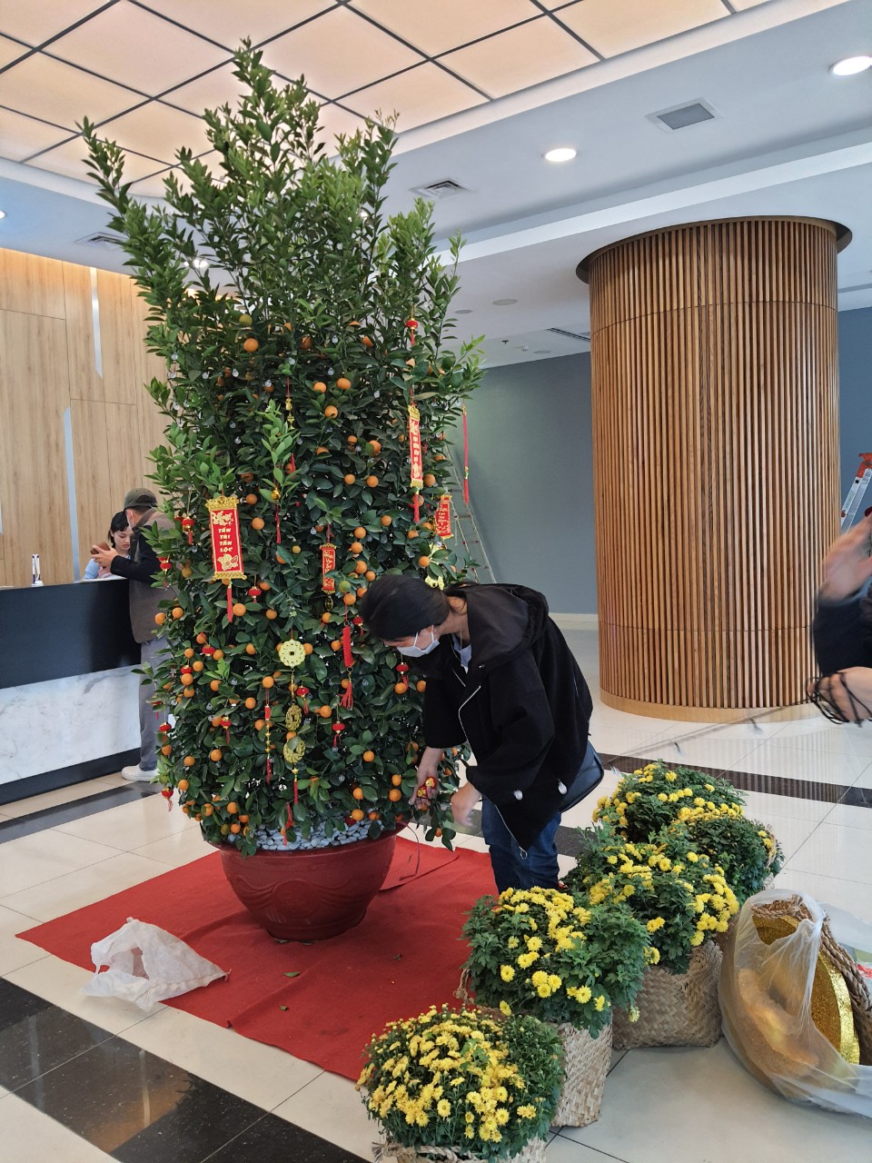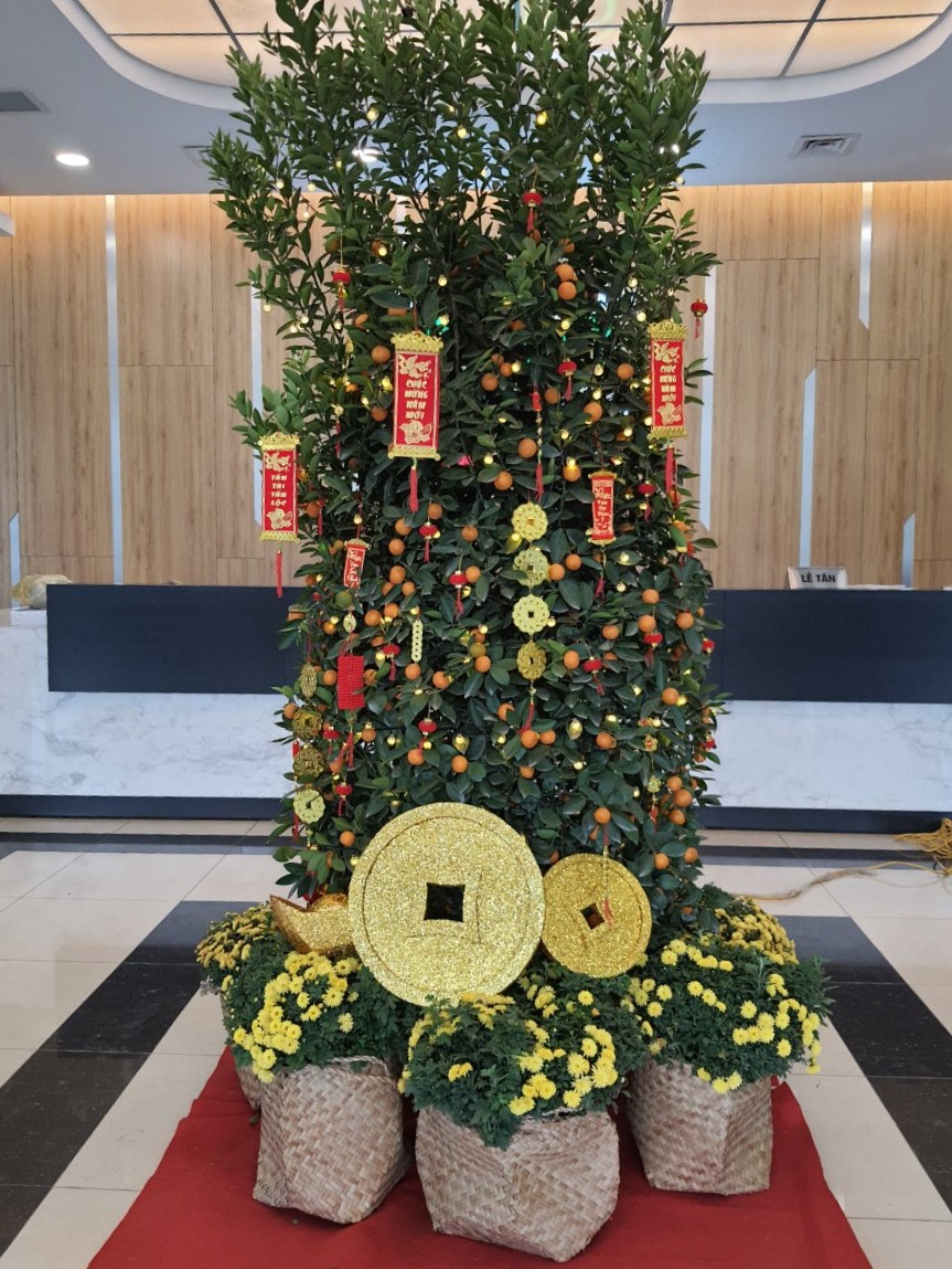 Khu vực cửa chính và sảnh Lễ tân được trang trí các loại hình ảnh rực rỡ, sống động nhiều sắc màu, đặc biệt là sự nổi bật của cây quất, một trong những hình ảnh tiêu biểu cho Tết cổ truyền Việt Nam.